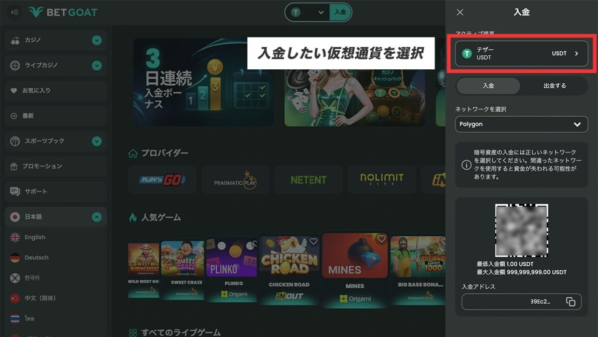 ベットゴートは、主要な仮想通貨に対応しているので、仮想通貨の種類で困ることはないはずですが、個人的にはUSDT(テザー)での入出金をおすすめしています。