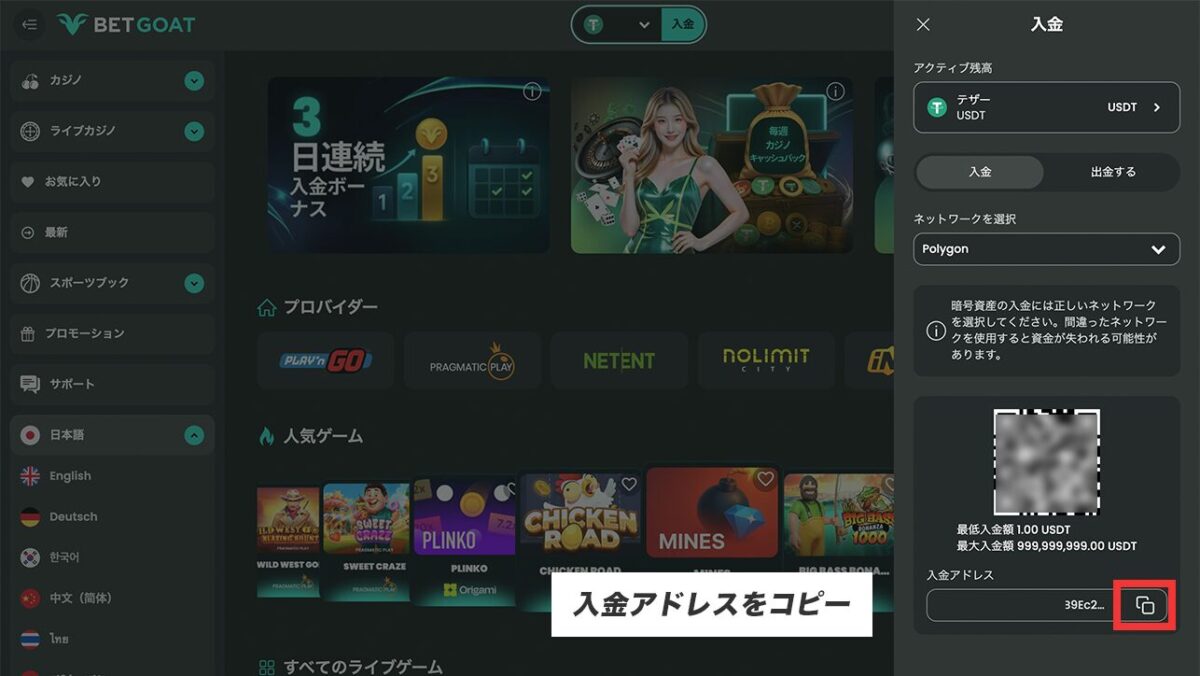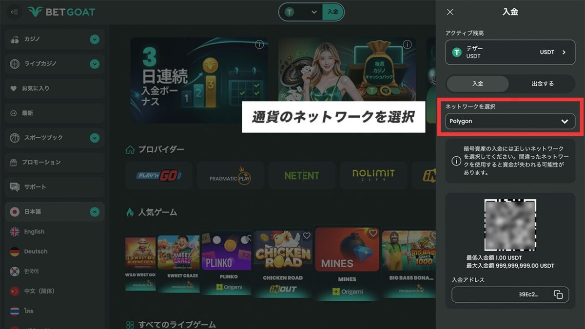 ネットワーク毎に入金アドレスは異なりますので、ベットゴートで選んだネットワークと出金元のネットワークは同じにするように注意しましょう。
