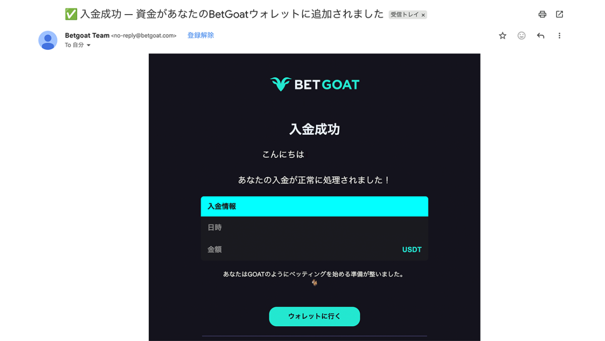 無事に入金が完了すると、ベットゴートより『入金成功』という件名のメールが届きます。